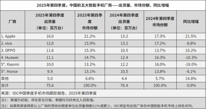 这就非常明显了,那就是这一季度,中国人爆买iPhone17系列,为苹果贡献了大量的营收,所以苹果公司整体营收、利润都是大增。 而从IDC之前发布的数据,我们也可以看到,2025年四季度,苹果拿下中国市场的第一名,销量高达1600万台,增长21.5%,份额高达21.2%,超过了所有其它品牌。