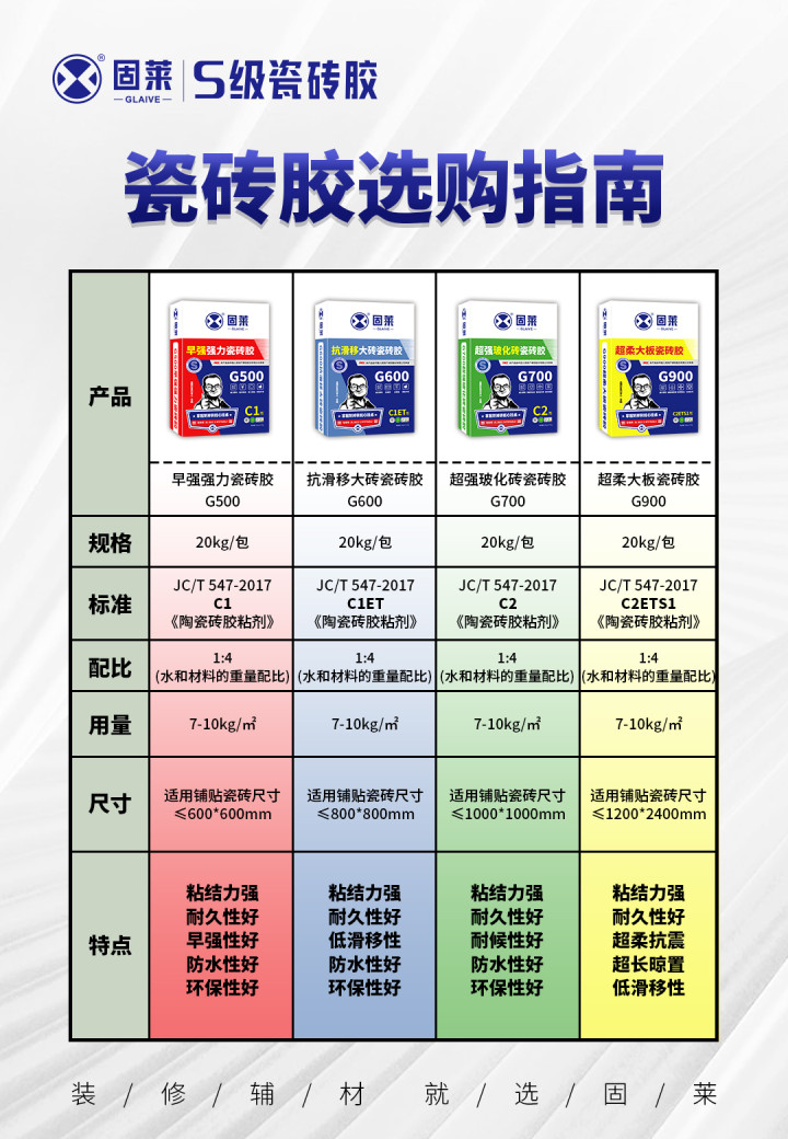 选购避坑小贴士 警惕 “低价劣质品”:低于 20 元 / 20kg 的产品多为水泥混合劣质胶粉,粘结强度不足,易导致瓷砖脱落。 拒绝 “万能胶” 噱头:不同瓷砖、环境需专用产品,声称 “什么都能贴” 的多为夸大宣传。 认准正规渠道:品牌官网、线下专卖店购买,保留票据,避免买到仿冒品。 结合自家瓷砖尺寸、装修环境和预算,参考以上攻略和品牌优势,就能选到合适的瓷砖胶,让瓷砖铺贴既牢固又美观,为家居生活增添一份安心。